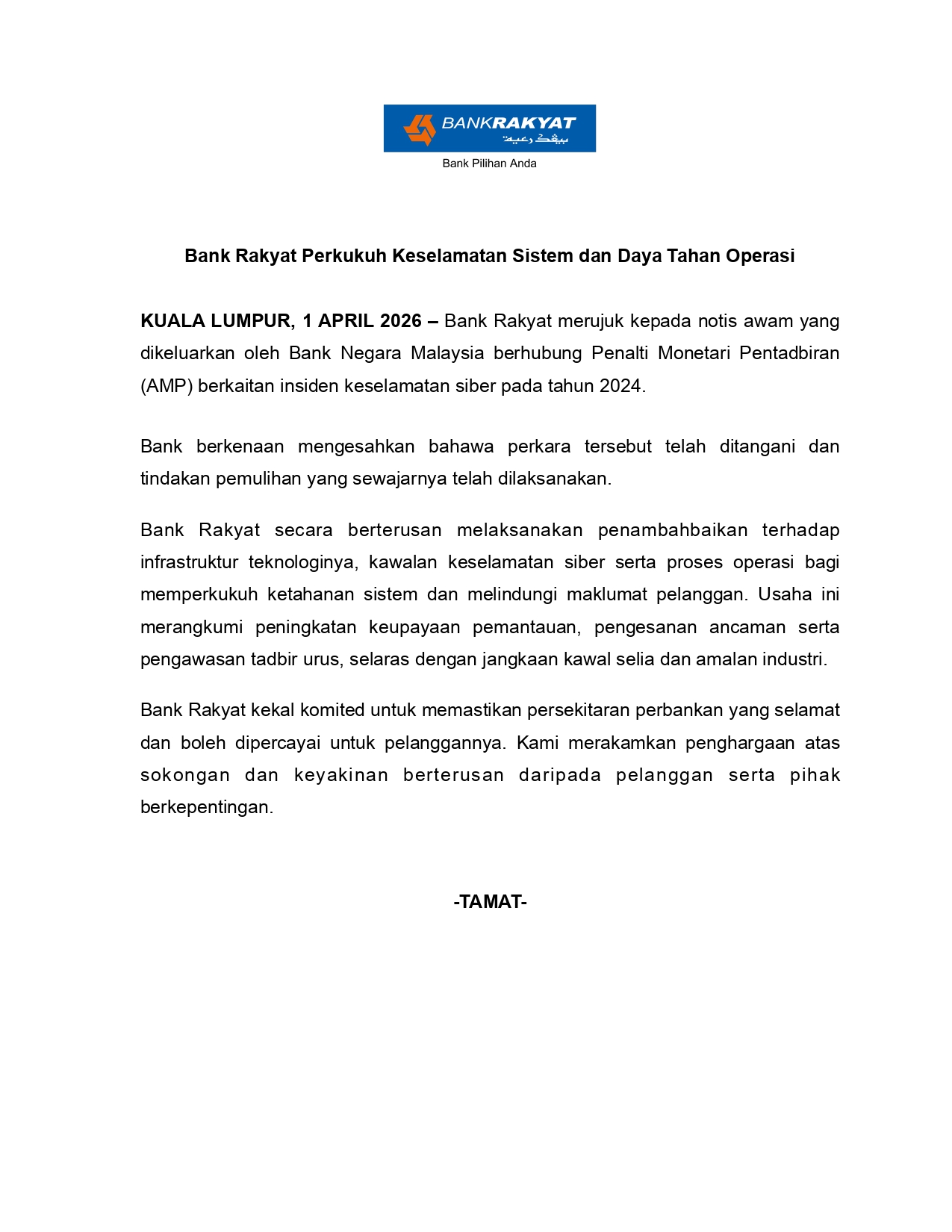 Bank Rakyat Perkukuh Keselamatan Sistem dan Daya Tahan Operasi